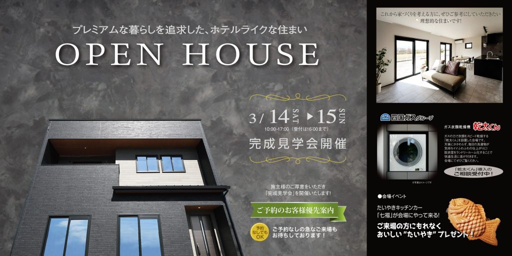 3月14日(土)・15日(日)「住まいの見学会」に御来場頂きましてありがとうございました。 休日の貴重なお時間、お忙しい中、足をお運びいただきまして心より感謝いたしております。 ご来場頂きました方々の住まいづくりの参考になりましたら、大変光栄です。 TEL 088-678-2305 受付時間/10:00-17:00 定休日/水曜日 PrevNext