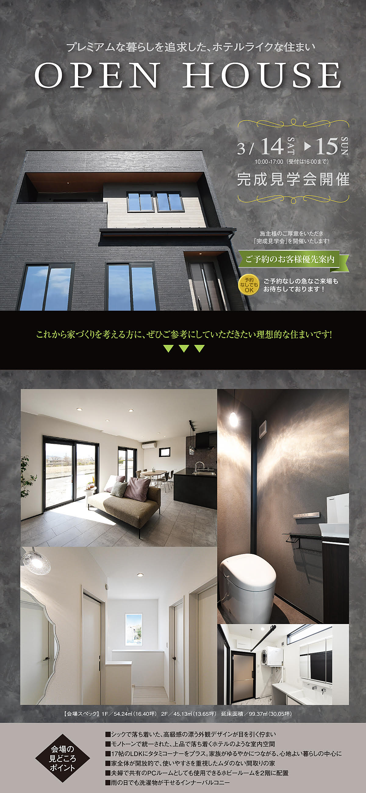 令和8年3月14日(土)・15日(日) 10:00~17:00 プレミアムな暮らしを追求した、ホテルライクな住まい 完成見学会 会場には、皆様のご質問にお答えできるよう、専門の係員が待機しております。 構造や工法、部材についての疑問点や間取り、資金づくりのご相談まで、なんなりとご相談ください。 新築・リフォームをお考えの方、家づくりを研究されている方、是非、この機会にご来場ください。 見学会ご来場のお問合せは以下よりお願いします。 TEL 088-678-4798 受付時間/10:00-16:00 定休日/水・木曜日 見学会のご予約 24時間受け付けております。 PrevNext